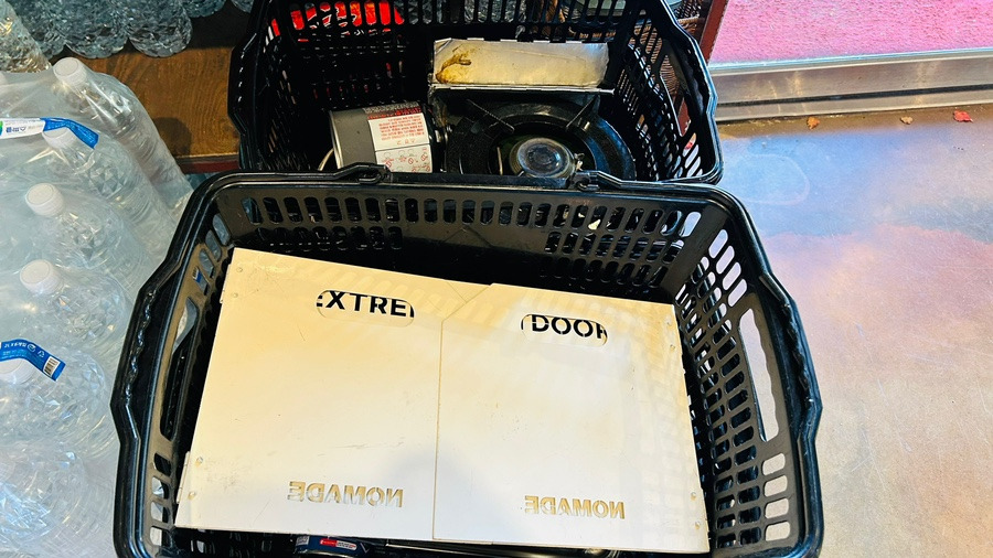 (바구니에는 버너와 바람막이가 있어요)